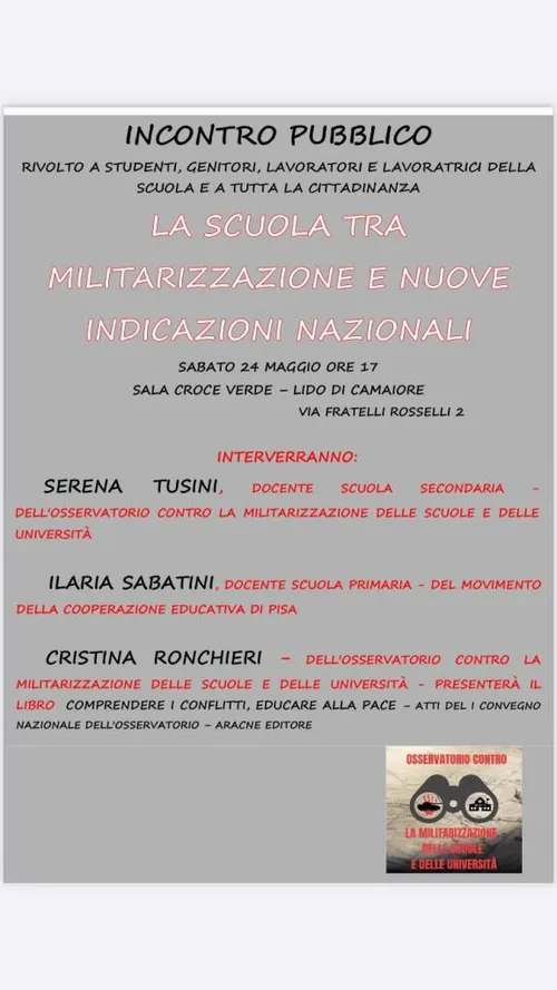 Osservatorio contro militarizzazione di scuole e università - Wednesday, May 21, 2025Sabato, 24 maggio 2025, ore 17.00, Sala Croce Verde, Lido di Camaiore, via Fratelli Rosselli, 2