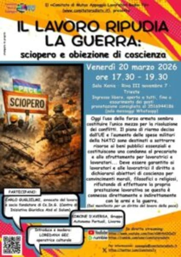 Pressenza - Thursday, March 19, 2026Segnaliamo che venerdì 20 marzo dalle 17.30 presso la sala Xenia di in Riva Tre Novembre a Trieste si terrà il convegno intitolato “Il lavoro ripudia la guerra, sciopero e obiezione di coscienza”, con la partecipazione dell’avvocato Carlo Guglielmi e Simone D’Aversa del Gruppo Autonomo Portuali di Livorno e la moderazione di Loredana Gec, operatrice culturale.