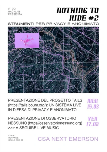 If_Do - Friday, March 3, 2023NOTHING TO HIDE #2 MERCOLEDÌ 15.03 >>> Dopo l’introduzione a Tails del mese scorso, un nuovo incontro con gli svilppatori del progetto per approfondire il funzionamento e i vantaggi del sistema operativo live che tutela la privacy e l’anonimato dei … Continue reading →