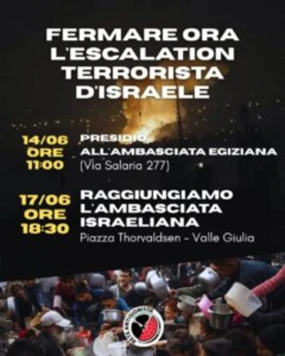 Compagni, la lotta è ora! Non possiamo stare zitti mentre i palestinesi muoiono e il mondo brucia! Scendiamo in piazza a Roma, uniti, per gridare “Stop al genocidio! Palestina libera!”. Partecipate alle manifestazioni pro-Palestina del 14 e 17 giugno, portate la vostra rabbia e il vostro cuore! La solidarietà è la nostra arma, la resistenza è il nostro dovere! Facciamo tremare i potenti, dalla Salaria a Valle Giulia, per un mondo senza oppressioni! Palestina vivrà, e noi saremo al suo fianco.