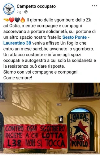 L38Squat - Tuesday, February 10, 2026In questa pagina stiamo raccogliendo i comunicati di solidarietà contro lo sgombero di L38Squat che stanno arrivando da altri gruppi, spazi ed individualità. Campetto Occupato Il giorno dello sgombero dello ZK ad Ostia, mentre compagne e compagni accorrevano a portare solidarietà, sul portone di un altro spazio nostro fratello, L38SQUAT, veniva affisso un foglio che … Leggi tutto "Comunicati di solidarietà contro lo sgombero di L38Squat"