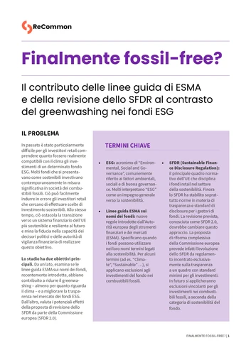 ReCommon - Wednesday, February 25, 2026Roma, 25 febbraio 2026 – Le nuove regole europee sui fondi “sostenibili” – dalle linee guida dell’Autorità europea dei mercati finanziari (ESMA) sui nomi dei fondi alla proposta di riforma della normativa europea SFDR – rappresentano un primo passo contro il greenwashing, ma lasciano ancora scoperta la parte più ampia del mercato. È quanto emerge dal nuovo rapporto Finally Fossil Free? (scaricabile in inglese a questo link) pubblicato da Urgewald, Finanzwende e Facing Finance.