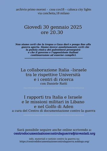Centro di documentazione contro la guerra - Thursday, January 23, 2025Archivio Primo Moroni – Calusca City Lights – CSOA Cox 18 via Conchetta 18 – Milano (MM2 Romolo, bus 90/91 e 47, tram 3) Giovedì 30 gennaio 2025 ore 20.30 Non siamo certi che la tregua a Gaza duri e ponga fine alla guerra aperta. Siamo invece assolutamente certi che la pulizia etnica […]
