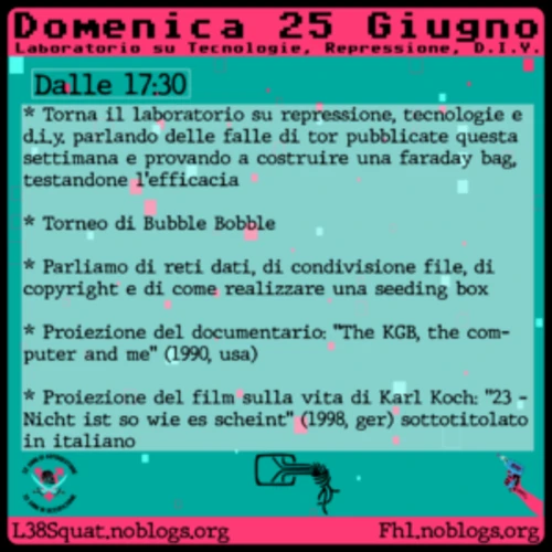 Domenica 25 Giugno – Laboratorio tecnologie, repressione e d.i.y. – Faraday Bag, Seeding Box, Etag Tor, Torneo di Bubble Bobble