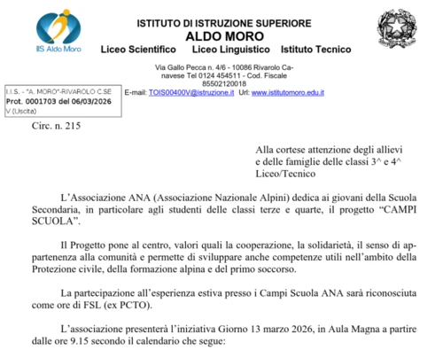 Osservatorio contro militarizzazione di scuole e università - Monday, March 23, 2026All’Istituto Superiore “Aldo Moro” di Rivarolo Canavese (TO) anche gli Alpini hanno avuto il loro spazio privilegiato per presentare ad alunne e alunni delle classi terze e quarte, e alle loro famiglie, il piano per le vacanze, organizzato in campi scuola estivi, di cui “la parola d’ordine” sarà «condivisione […di un’] esperienza indimenticabile». La segnalazione di un genitore arriva il 13 marzo scorso all’Osservatorio contro la militarizzazione delle scuole e delle università e, nel corpo della email si fa notare, molto opportunamente, che le vacanze non saranno davvero tali, almeno sul piano formale, perché varranno come ore del pacchetto Formazione Scuola-Lavoro.