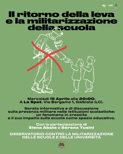 L’Osservatorio contro la militarizzazione delle scuole e delle università parteciperà alla serata informativa presso Lo Spot, in Via Bergamo 1 a Galbiate (LC), dal titolo: “Il ritorno della leva e la militarizzazione della scuola“.