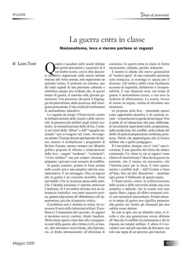 Ospitiamo con piacere sul nostro sito l’interessante contributo scritto da Laura Tussi, pubblicato su Tempi di Fraternità del mese di marzo 2026 in cui viene ribadito quanto l’Osservatorio denuncia da due anni a questa parte, vale a dire un pericolosissimo processo di occupazione degli spazi del sapere e della formazione da parte delle Forze Armate e di strutture di controllo, in particolare in relazione al ritorno della leva obbligatoria in Italia e in Europa.