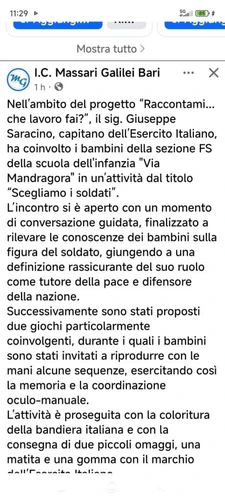 Osservatorio contro militarizzazione di scuole e università - Tuesday, April 7, 2026In queste settimane nei due plessi Montello e via Mandragora della scuola dell’infanzia dell’IC “Massari-Galilei” di Bari è partito il progetto “Raccontami … che lavoro fai?”, che prevede il coinvolgimento diretto dei genitori nelle attività scolastiche, con brevi momenti di gioco strutturato e laboratori. Così le piccole e i piccoli bambini, guidati dalle maestre e dal genitore invitato, hanno di volta in volta costruito un autolavaggio, simulato la gestione di un fast food McDonald’s, giocato a lavorare come commessi in un negozio di scarpe, simulato il lavoro dell’infermiere con cerotti e termometri giocattolo, ascoltato dal papà agronomo la storia sui semi che diventeranno piante.