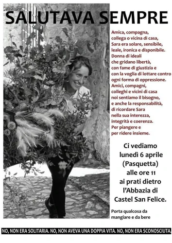 La Nemesi - Sunday, April 5, 2026Aggiornamento urgente sulla pasquetta in ricordo di Sara Lunedì 6 aprile abbiamo pensato di passare insieme la Pasquetta tra amiche, colleghe, vicine di casa e compagni di Sara, in uno…