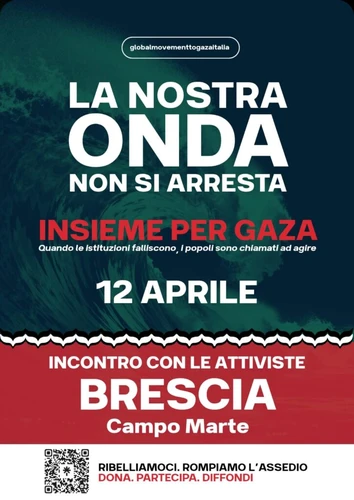 “La nostra Onda non si arresta-Insieme per Gaza” è il titolo dell’evento che si svolge domenica 12 aprile a Campo Marte a Brescia promosso da Global Movement to Gaza per raccogliere fondi a sostegno della nuova missione della Global Sumud Flotilla.