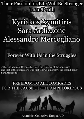 On 31/10/24, the anarchist comrade Kyriakos Xymitiris lost his life, after an explosion in an apartment in Ampelokipi during the manufacture of explosives. The anarchist comrade Marianna M was also in the apartment and was seriously injured. For this case, the injured comrade Marianna. M, the anarchist comrade Dimitra Z. and comrade Dimitris (for the … Continue reading Poster posted on the streets of Komotini (Northern Greece) →