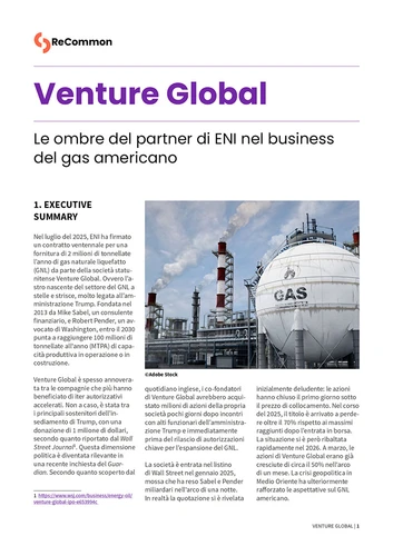 ReCommon - Thursday, April 9, 2026Roma, 9 aprile 2026 – ReCommon lancia oggi il suo nuovo rapporto “Venture Global, le ombre del partner di ENI nel business del gas americano”. Nella pubblicazione si esaminano le diverse criticità legate alla società del settore del gas naturale liquefatto (GNL) statunitense Venture Global, con la quale ENI nel luglio del 2025 ha firmato un contratto ventennale per una fornitura di 2 milioni di tonnellate l’anno di GNL.