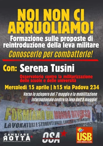 Per combattere queste nuove proposte bisogna conoscerle e smascherarle, convochiamo quindi una formazione con Serena Tusini dell’Osservatorio contro la militarizzazione delle scuole e delle università mercoledì 15 aprile nella sede USB di Via Padova 234 per iniziare ad organizzarci in vista delle giornate di lotta del 7 e 8 maggio!