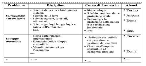 Sarebbe già un passo in avanti, verso il futuro, chiedere che ad occuparsi della presentazione delle diverse discipline siano i nostri più giovani ricercatori e, soprattutto, quelli disposti a farsi interrogare a proposito delle ipotesi e degli obiettivi che si stanno ponendo con le ‘loro e specifiche ricerche’ in economia, o in diritto, o in ingegneria, ecc. e quali, fra dieci anni e giù di lì, si dovranno o sarebbe opportuno che si occupassero, i loro colleghi futuri, quelli interessati, come lo sono loro oggi, all’ingegneria, all’economia, alla filosofia, alla matematica, alla fisica, alla salute, ecc. (‘Chi fra 10, 15, 20 anni sarà un ricercatore di ingegneria, economia, biologia ecc. di cosa si occuperà?).