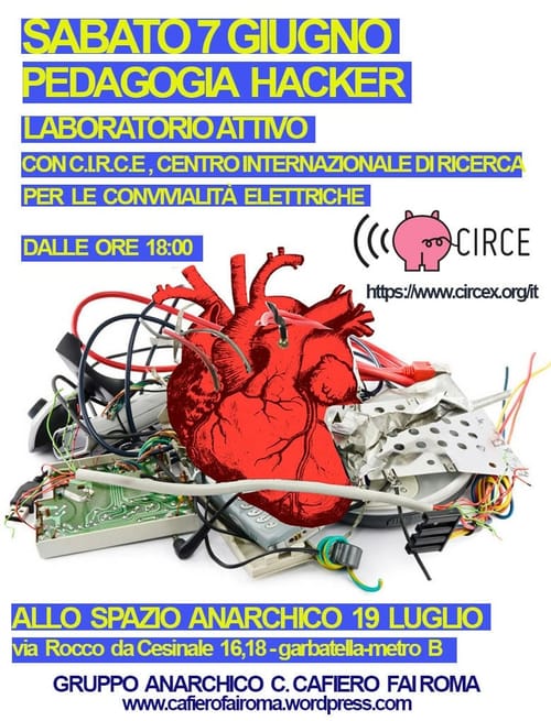 Sabato 7 giugno a partire dalle ore 18:00 ci sarà il secondo laboratorio attivo di Pedagogia Hacker con CIRCE, Centro internazionale di ricerca per le convivialità elettriche, https://www.circex.org/it, allo Spazio Anarchico 19 Luglio in via Rocco da Cesinale 16,18 a Garbatella (Metro B). La pedagogia hacker attraverso un metodo innovativo mette in relazione la tecnologia con i corpi, l'arte e il gioco, in modo partecipato e creativo ci permette di ampliare consapevolezza e libertà. L'obiettivo della pedagogia hacker è di migliorare la nostra relazione con i dispositivi digitali nella vita di tutti i giorni e usare l'apprendimento come piacere e la ricerca come frutto dell'esperienza personale. Possiamo decostruire le relazioni tecniche per riappropriarcene in un senso "conviviale", cioè volto a un benessere collettivo che includa gli stessi dispositivi digitali.