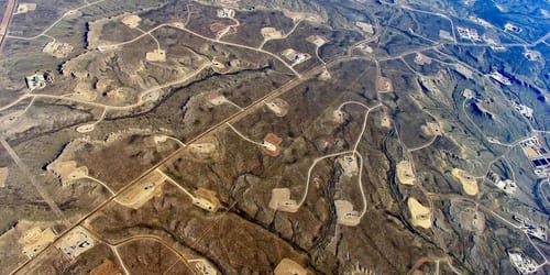 Immagine di copertina di Bruce Gordon per EcoFlight (Flickr) – Vista aerea di impianti di estrazione di petrolio tramite “fracking”