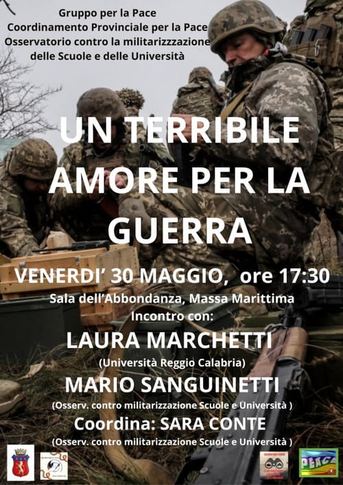 Il Gruppo per la Pace di Massa Marittima, in collaborazione con il Coordinamento Provinciale per la Pace di Grosseto e l’Osservatorio contro la Militarizzazione delle scuole e delle Università, ha organizzato, per venerdì 30 maggio, presso la Sala dell’Abbondanza di Massa Marittima (ore 17:30) una conferenza sul tema “Un terribile amore per la guerra”, ispirato al titolo di un famoso libro dello psicologo James Hillman.