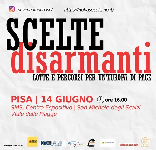 La Città invisibile | perUnaltracittà | Firenze - Friday, June 6, 2025L’occasione di confronto e crescita che si terrà il 14 giugno a Pisa, per iniziativa del Movimento No base né a Coltano né altrove vuole affrontare le dinamiche concrete del bellicismo imperante e delle sue ricadute sui territori, con l’aiuto … Leggi tutto