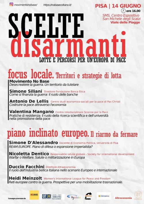 Il 14 Giugno dalle 16 presso il centro espositivo di San Michele degli Scalzi, a Pisa, il Movimento No Base organizza un convegno su economia di guerra, il piano di riarmo europeo e gli investimenti nelle infrastrutture militari. Il tema delle risorse economiche, investite dal Governo per alimentare le spese belliche invece di sostenere il benessere della cittadinanza e incentivare un’economia di pace, è stato da subito portante nell’analisi e nella spinta all’agire contro la nuova base militare.