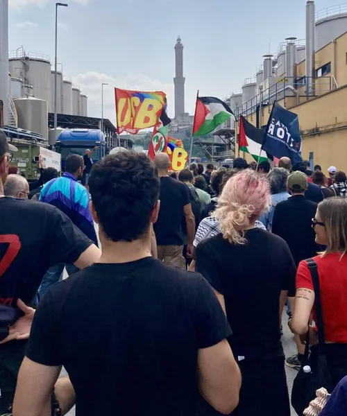 La collaborazione con i portuali organizzati di altre città è un punto di forza di questa lotta. La nave della compagnia israeliana ZIM sarebbe dovuta arrivare a Genova con un carico di quattro containers pieni di materiale bellico da Marsiglia e destinata a Israele, ma i portuali di quella città si sono rifiutati di caricarli. La nave è così arrivata a Genova con un giorno di ritardo rispetto al previsto e senza il famigerato carico di morte. Tutto questo era già a conoscenza del CALP e l’informazione era stata condivisa il giorno precedente in una affollata assemblea a Music For Peace. Nonostante questo, si è deciso di proseguire con la manifestazione in programma per sabato (personalmente, la considero una scelta sacrosanta).