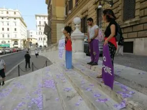 L’azione è stata svolta davanti al Ministero dell’Economia e delle Finanze per portare in luce questo, fra i tanti problemi del Reddito nella sua forma attuale. Le banconote da 0 euro simboleggiano tutti i soldi che non vengono dati alle persone richiedenti. Le catene, invece, simboleggiano quanto queste persone siano ancora legate alle Istituzioni per potersi salvare la vita. In Italia, infatti, ci sono stati da gennaio 2025 già 24 femminicidi accertati; di questi 21 sono stati commessi da mariti, ex mariti, compagni, ex compagni, o figli delle vittime. Questo dimostra ampiamente che la maggior parte dei femminicidi sono la punta dell’iceberg di rapporti violenti con persone strette, vicine, famigliari. Quanti di questi femminicidi avrebbero potuto essere evitati con un Reddito di Libertà dal funzionamento ed efficacia migliori?