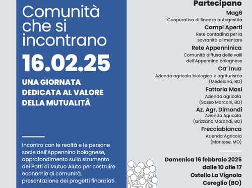 CampiAperti - Friday, February 14, 2025Bentrovat! Vi aspettiamo domenica 16 febbraio dalle 10 alle 17, all’Ostello di Cereglio, per la giornata aperta dedicata al valore della mutualità e alle pratiche di economia di comunità esistenti all’interno della comunità diffusa sul territorio, nelle reti di relazioni e nelle progettualità che la attraversano. Fateci sapere se partecipate, sopratutto per via dell’organizzazione del lauto pranzo che stiamo […]