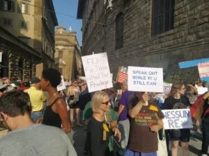 Circa 100 persone, statunitensi e non solo, hanno risposto all’appello dell’Associazione Good Trouble Firenze e si sono radunate nel pomeriggio del 14 giugno in via dei Gondi, a lato di Palazzo Vecchio.