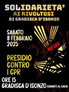 Hurriya - Monday, February 3, 2025Fonte: NO Frontiere FVG Solidarietà ai rivoltosi di Gradisca: presidio pubblico, 8 febbraio 2025 Il 21 gennaio, nel CPR di Gradisca d’Isonzo, la paura e l’isolamento hanno cambiato campo. Dopo due giorni di scontri, diversi fuochi sono stati accesi nella … Continua a leggere→