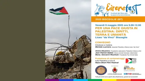 Le iniziative per l’Eirenefest sono partite venerdì 9 maggio 2025 con un Convegno presso il Liceo “Leonardo da Vinci” Bisceglie rivolto alle classi V nell’ambito dell’educazione civica dal titolo “PER UNA PACE GIUSTA IN PALESTINA: DIRITTI, TERRA E UMANITÀ”.