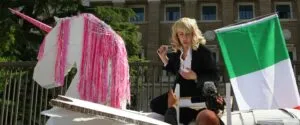 Pressenza - Wednesday, April 30, 2025La quarta giornata della Primavera Rumorosa di Extinction Rebellion a Roma, ieri 29 Aprile, comincia con un unicorno di tre metri cavalcato da una sosia della Presidente del Consiglio che sventola una bandiera tricolore davanti al cancello del Palazzo dell’Aeronautica del Ministero della Difesa.