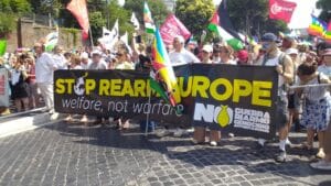 Il fiume di persone che aveva trovato riparo dal sole cocente sotto gli alberi di Porta San Paolo si è mosso verso le 14.30. E’ partito così il lungo corteo della manifestazione nazionale contro il riarmo, sul quale spiccano migliaia di bandiere della pace e palestinesi. C’è il variegato mondo pacifista delle 500 sigle che hanno aderito, le forze politiche di opposizione e i sindacati. Ma soprattutto tanta gente comune che ha voluto esserci per gridare il proprio no alla folle politica di aumento delle spese militari da parte dell’Europa, per dire basta al genocidio del popolo palestinese, basta con l’aggressione di Israele all’Iran, basta con la guerra Russia-Ucraina.