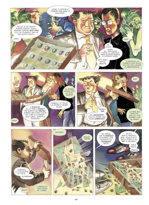Oscar Zarate, che cita Hugo Pratt e Milton Caniff tra i suoi ispiratori giovanili, sembra qui aver metabolizzato anche la lezione cromatica della scuola italiana del tempo e in particolare del gruppo Valvoline. Un Moore forse mai così libero e sperimentale si intesta l’altro 50% di questo graphic novel – tra le altre cose, vincitore dell’Eisner Award (1994), oggi meritoriamente riedito da Mondadori con un’intervista agli autori di Jaime Rodriguez come postfazione. “Penso che Un piccolo omicidio sia uno dei fumetti migliori che abbia mai scritto, di certo uno dei più belli a vedersi”. Riletto oggi ci sta tutto.