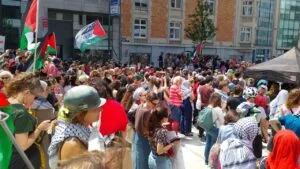 Ieri è stata una giornata densa di flash mob e manifestazioni in diverse zone della città, in particolare quella serale davanti alla Borsa, dove è stata srotolata un’enorme bandiera palestinese e dove i militanti, soprattutto molti palestinesi e comunque cittadini stranieri hanno intonato canti e slogan e come “Tous le monde deteste les sionistes” o “Siamo tutte antifasciste”, e “So so so solidarité avec le peuple palestinien”.