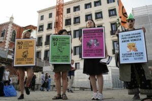 “Venezia, l’Italia e il pianeta non hanno bisogno di graziose concessioni filantropiche. Siamo cittadini, non sudditi” – afferma Jorge di Extinction Rebellion – “Le stesse persone che stanno causando la scomparsa della nostra città sono qui a festeggiare, col benestare del sindaco Brugnaro, imprenditore indagato per corruzione”. Un messaggio che sarà rilanciato sabato 28 giugno, in una grande manifestazione nel giorno del grande party finale, spostato all’Arsenale per tentare di ridurre l’impatto delle contestazioni.