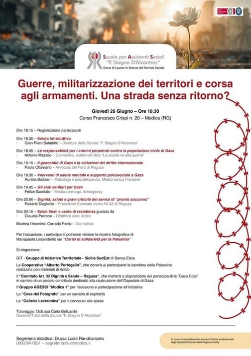 #stopthewar - #Modica (Ragusa), giovedì 26 giugno, ore 18.30 - #Guerre, #militarizzazione dei territori e corsa agli armamenti. Una strada senza ritorno?