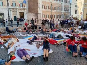 I circa duecento partecipanti si sono infatti stesi per terra nella Piazza antistante la Camera dei Deputati mentre veniva trasmessa la registrazione di un bombardamento a Gaza dell’aviazione Israeliana.