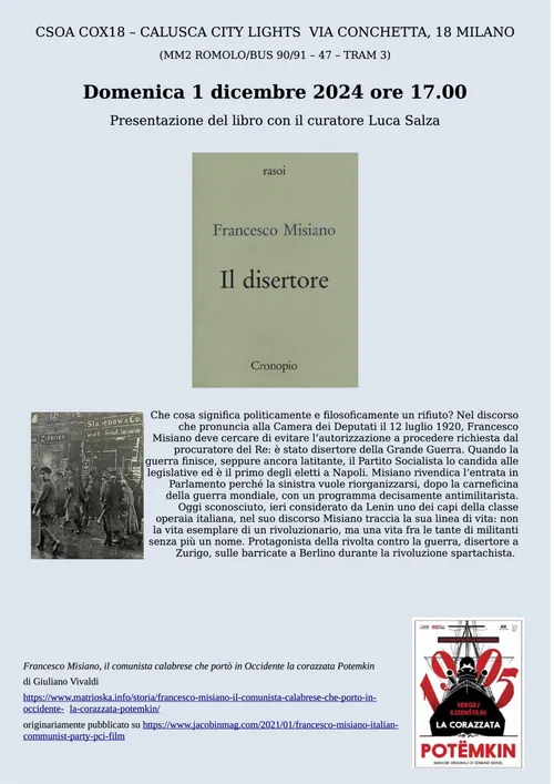 Centro di documentazione contro la guerra - Wednesday, November 27, 2024Dal passato della lotta tra le classi un’indicazione per il disfattismo contro la guerra dell’oggi La pubblicazione del libro Il disertore, che con una lunga presentazione di Luca Salza, propone il discorso tenuto alla Camera da Francesco Misiano, allora deputato socialista, poi del PCd’I, il 12-7-1920 in propria difesa contro la richiesta di autorizzazione a […]