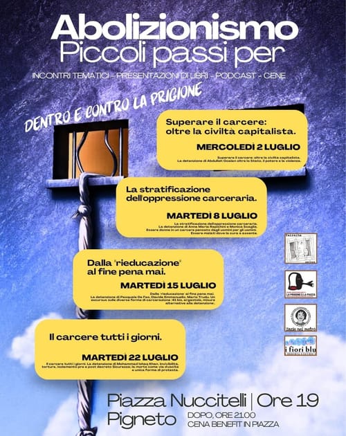 2-8-15-22 luglio, Piazza Nuccitelli al Pigneto, alle ore 19:00 . Al termine dell'incontro, cena benefit in piazza preparata da Zazie nel Metrò: parte del ricavato sarà devoluto all'associazione Yairaiha, che dal 2006 si impegna per contrastare il carcere e le sue violenze.