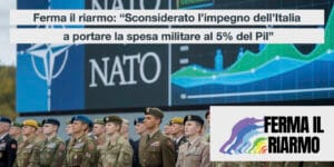 La campagna “Ferma il riarmo” chiede al governo italiano e agli altri Paesi NATO di non formalizzare l’impegno al 5% (che è solo un obiettivo politico, non un obbligo giuridico e mai giustificato nemmeno dal punto di vista militare), di fermare l’attuale corsa al riarmo che ci sta portando sul baratro della terza guerra mondiale, invertendo anzi la rotta e liberando così risorse per investimenti più utili e necessari, e di tassare gli extra profitti delle aziende della difesa.