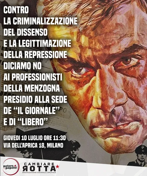 Contropiano - Tuesday, July 8, 2025Diciamo no ai professionisti della menzogna Giovedì 10 luglio, ore 8:30 Presidio alla sede de Il Giornale e Libero quotidiano Via dell’Aprica 18, Milano Entrambi questi fogliacci sono da sempre in prima linea contro i lavoratori e ogni opposizione sociale e politica nel paese, e tra i maggiori tifosi del […]