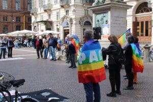 Se, come è probabile, tra le storiche e gli storici del futuro ci sarà chi adotterà una chiave di lettura pacifista o antipacifista, può essere utile che resti una traccia della 165° Presenza di pace che si è svolta sabato 26 aprile 2025 a Torino in Piazza Carignano promossa dal Coordinamento AGITE. La piccola agorà di pace che da tre anni viene svolgendo ed elaborando un pensiero collettivo di pace ha saputo unire nel segno della ricerca della pace la gioia per la ricorrenza della Liberazione e il cordoglio per la scomparsa di una figura profetica del nostro tempo: “Più dei concetti e delle volontà, conta il sentirsi umani insieme. Francesco, un uomo buono, un uomo di tutti e per tutti, ha fatto incontrare molti nel riconoscere e coltivare la nostra umanità. Ha sempre insegnato e raccomandato a tutti di riconoscere che siamo un’unica umanità, unita nelle belle differenze, e che la guerra è offesa a tutti, tutti, tutti, ed è il più grave fallimento umano. L’ultimo suo grido, con l’ultima sua voce, è stato la necessità del disarmo per fondare la pace” (Enrico Peyretti).