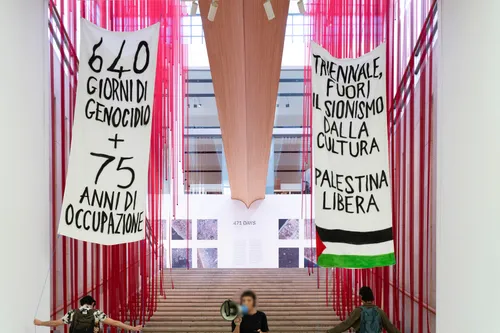 Radio Onda Rossa - Thursday, July 10, 2025Martedi 8 luglio, Galassia, Assemblea antisionista dell3 lavorator3 dell’arte e della cultura ha organizzato un’azione dimostrativa nella hall e sulla scalinata centrale della Triennale di Milano, dove è allestita l'installazione 471 Days, dedicata a Gaza. L’intento era quello di denunciare pubblicamente, all’interno degli spazi della Triennale, la complicità dell’Esposizione Internazionale Inequalities con il genocidio in corso a Gaza e con la colonizzazione sionista della Palestina. All’azione hanno preso parte circa 50 attivist3. Due striscioni verticali sono stati calati dal piano superiore, riportando le frasi: “640 giorni di genocidio + 75 anni di occupazione” – in riferimento diretto al titolo dell’opera 471 Days – e “Triennale, fuori il sionismo dalla cultura. Palestina libera”. Durante l’azione è stato letto un comunicato che ne spiegava le motivazioni, seguito da cori a sostegno della Palestina. L’iniziativa ha visto anche la partecipazione inattesa di visitatori e visitatrici dell’esposizione, oltre che di alcuni membri dello staff della Triennale, che hanno espresso il proprio supporto con applausi e unendosi ai cori. Ne parliamo con un compagno di Galassia