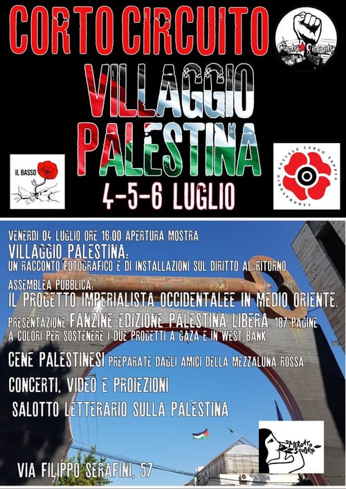 Radio Onda Rossa - Friday, July 4, 2025In comunicazione telefonica con Spartaco e Chiara, del CSOA Corto Circuito e del Laboratorio Sociale Largo Tappia, abbiamo presentato la tre giorni Villaggio Palestina, che si terrà dal 4 al 6 luglio al Corto Circuito, nella quale ci sarà una mostra fotografica, assemblea pubblica, concerti e proiezioni per parlare della Palestina.