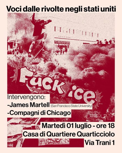 Radio Onda Rossa - Friday, June 27, 2025A Roma, alla Casa di Quartiere di Quarticciolo, martedì 1\07 si terrà un dibattito con un professore dall'università di San Francisco e con compagni da Chicago per confrontarsi sulle rivolte di inizio giugno negli USA contro le deportazioni e il razzismo sistemico. In studio abbiamo avuto un ospite con cui abbiamo ripercorso quei momenti di rivolta e riflettuto sugli spazi di lotta che essi hanno aperto.