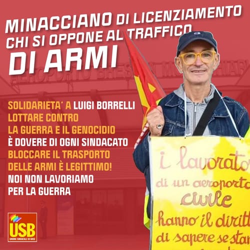 Radio Onda d`Urto - Thursday, July 17, 2025“Io sto con Luigi – noi non lavoriamo per la guerra”. E’ con queste parole che il sindacato di base Usb dà appuntamento oggi, giovedì 17 luglio, davanti alla Prefettura di Brescia in Piazza Duomo, in solidarietà con Luigi Borrelli, aeroportuale dello scalo civile e commerciale di Montichiari che ha denunciato il traffico di armamenti e munizioni presso l’aeroporto bresciano.
