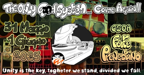 “The Only Good System...come again!” è la seconda ed ultima tappa presso il CSOA Forte Prenestino di un percorso che prosegue dall’autunno del 2023 e che nasce, tempo addietro, grazie alla sinergia tra centri sociali e reggae sounds attivi nella promozione della cultura dal basso, declinata secondo l'antifascismo, l'antirazzismo, l'antisessismo, il no all'omofobia, l'anticapitalismo, l’appoggio alla causa palestinese ed un fermo no alla gentrificazione; il tutto realizzato attraverso la pratica del D.I.Y. e della riappropriazione degli spazi.