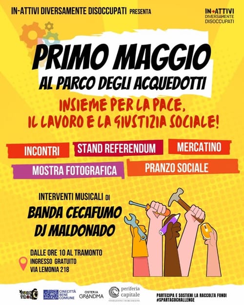 Giovedì dalle ore 10:00 fino al tramonto vi aspettiamo al Parco degli Acquedotti per questa giornata gratuita di festa e attivazione promossa da Inattivi Roma, insieme al Centro Sociale Spartaco e Cinecittà Bene Comune con incontri di approfondimento, mercatino solidale, stand referendum, mostra fotografica e info point.
