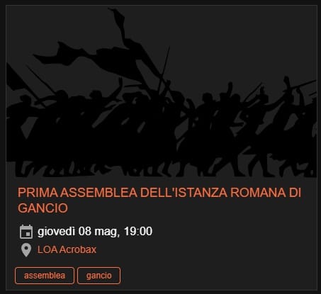 Gancio de Roma, Agenda condivisa della Roma ribelle e autogestita, è un luogo virtuale autonomo dove inserire e ritrovare eventi e appuntamenti militanti di Roma e territori limitrofi.